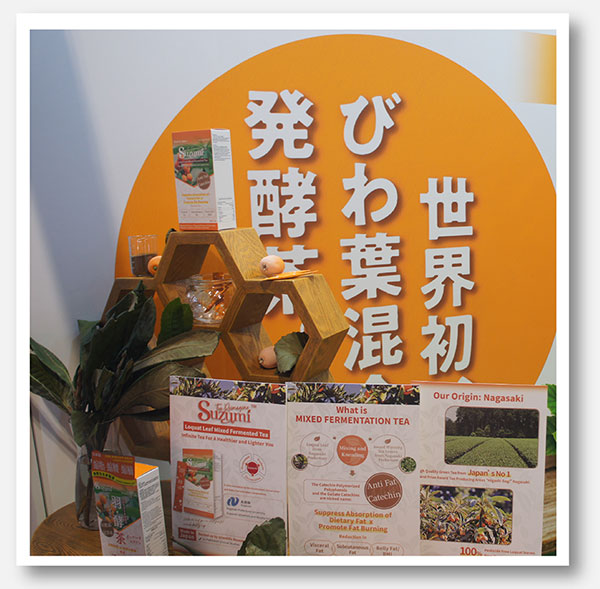 記者會提到的天然茶,到底是甚麼一回事?原來是長崎縣立大學、長崎大學以及九州大學共同研發出的混合發酵法,並利用當地枇杷果葉而製成的新茶飲:枇杷葉混合發酵茶。