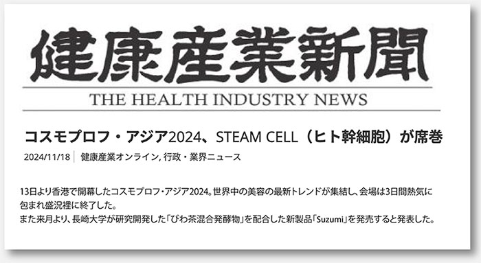 由長崎3間大學共同研發的新茶葉發酵技術,絕對是健康新革命。日本作為喫茶民族,對於混合發酵茶的橫空出現,能夠生成全新味道及健康成分,新聞界當然視為頭等大事。《健康產業新聞》就報道了Suzumi羽.酵茶在香港參展以及發售的消息,更訪問了香港的負責人,期望在日本形成新潮流的羽.酵茶,在香港也會產生重大影響力。